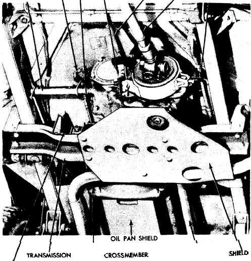 b.Remove Transmission Shield (fig. 6). Remove the cap screwsthat secure the exhaust pipe clamp to the shield, and remove theclamp.Remove the five bolts that secure the transmission shield tothe transmission support crossmember. Remove the transmissionshield.c. Remove Brake Springs and Speedometer Cable (fig. 6).Remove the hand brake spring.Remove the foot brake spring lead-ing from the bottom of the brake pedal to the transmission supportcrossmember.Disconnect the speedometer cable at the transfer case.