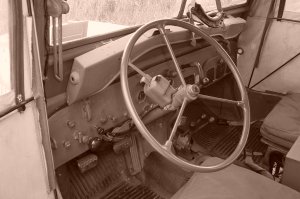 The interior is mostly stock. The floor is covered with black carpet heavy rubber mats to help absorb noise. In the picture at the right you can see a big black knob on the dash. This is the cold weather primer pump. You can also see an extra switch next to the light master switch, this is the defroster switch. The defrosters are stowed when not in use in the little metal boxes secured to the right rear fender well. They’re visible in the picture below.