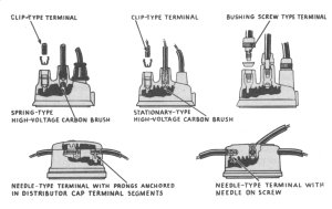Remove the distributor cap without removing the high-voltage cables. Insepct the inside and outside for cracks and carbon runners. These carbon runners are caused by the high-voltage spark’s jumping and burning the material of which the cap is made. Moisture inside the distributor cap is usually responsible. If cracks of carbon or runners are found, replace the distributor cap. Emergency repairs may be effected by scraping out the carbon runner with a knife or sharp tool.Trouble Shooting – Distributor